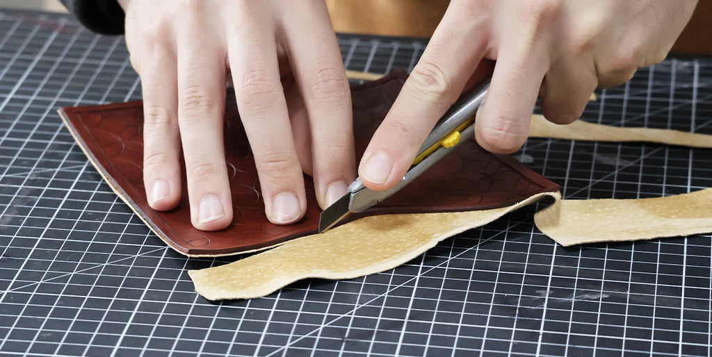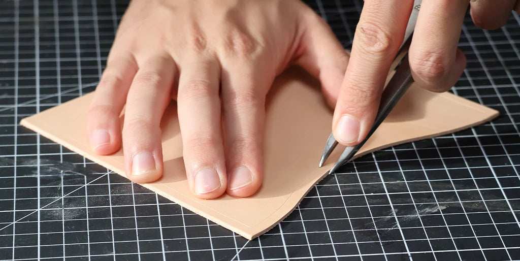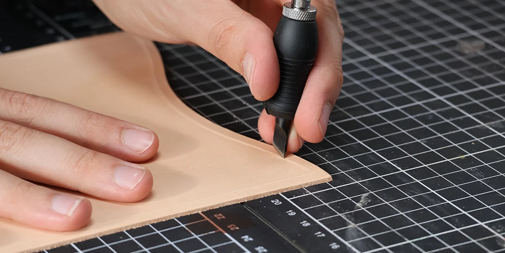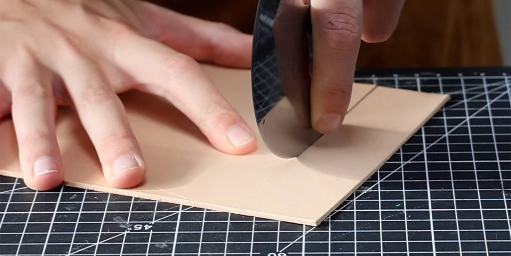 Tracer le patron sur le cuir puis découper la pièce principale à l’aide de l'outil de coupe de votre choix (tranchet, cutter, couteau demi-lune...) et d’une règle.