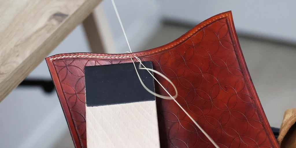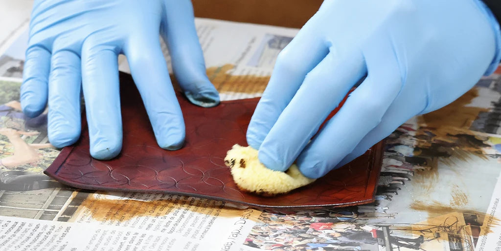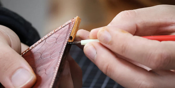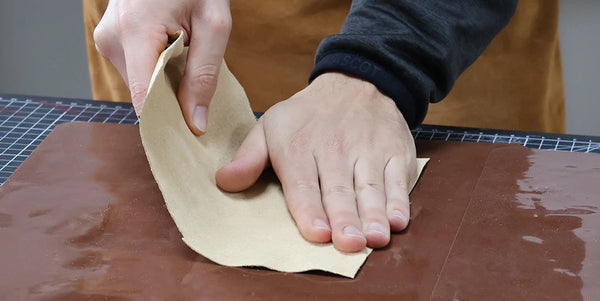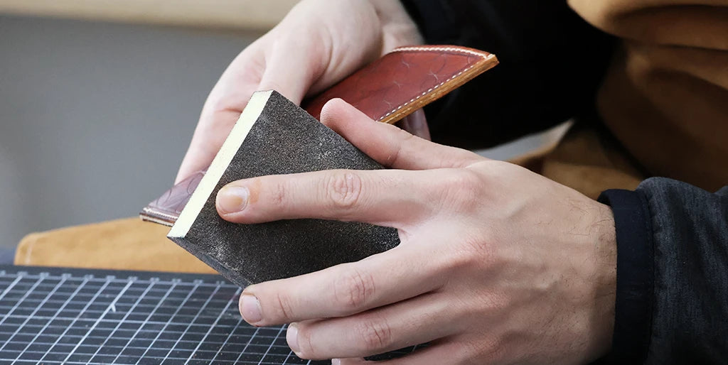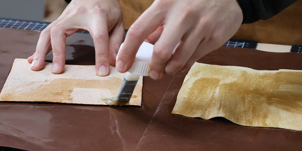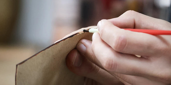 Appliquer une couche de teinture Fiebing's Pro Dye (utilisée pour la pièce principale) puis du Tokonole pour un bord lisse et brillant.
