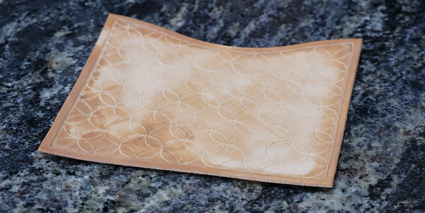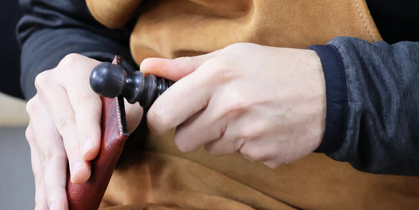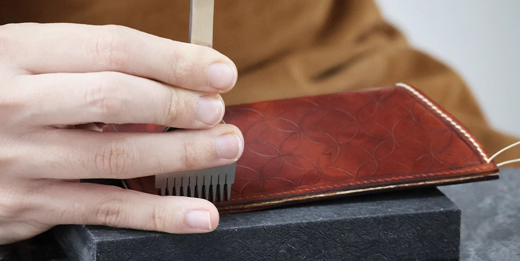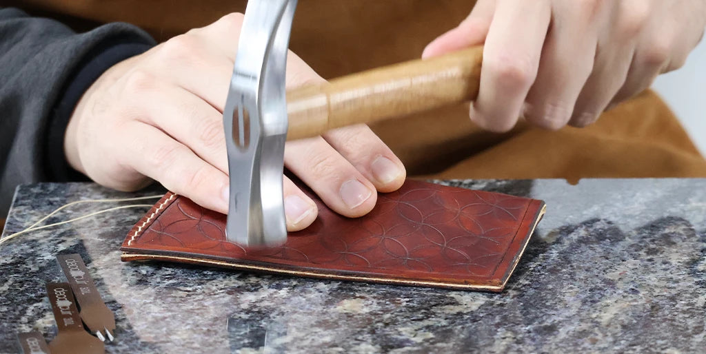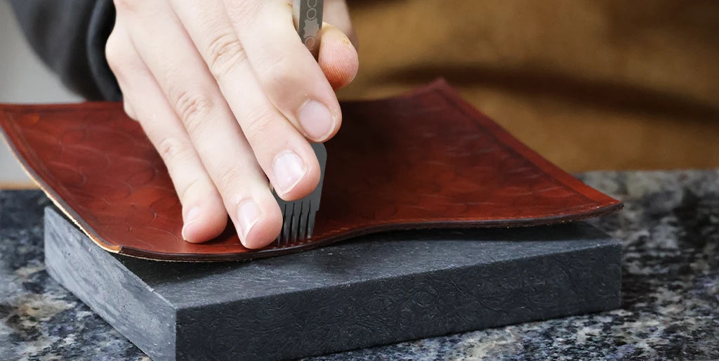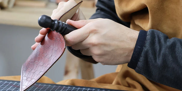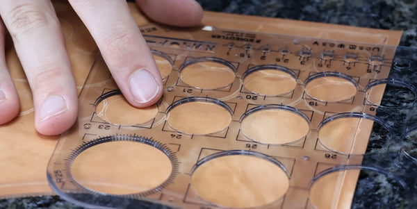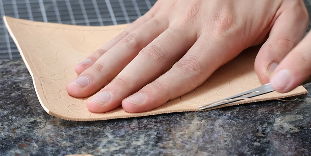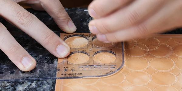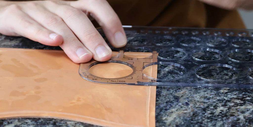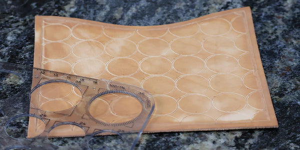 Humidifier le cuir avec un mélange composé d’un volume d’Easy Carve pour dix volumes d’eau. Avec un trace-cercle et une alêne ronde, tracer une ligne de demi-cercles en bas de la pièce. Nos cercles ont un diamètre de 24 millimètres.