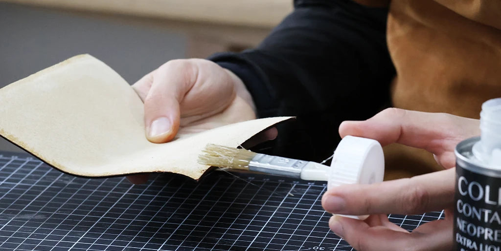 Appliquer de la colle contact sur l’envers de la pièce et sur l’envers de la doublure (cuir de porc). Contrecoller soigneusement les deux éléments et bien aplatir le collage.