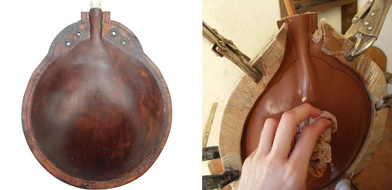 Il faut d'abord saturer complètement le cuir avec de l'eau. La manière la plus facile est d'immerger entièrement la gourde dans une bassine d'eau. Attention à la température de l'eau ! Celle-ci doit être chaude mais non bouillante, sinon vous allez « cuire » votre peau...