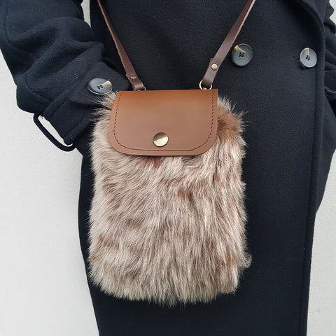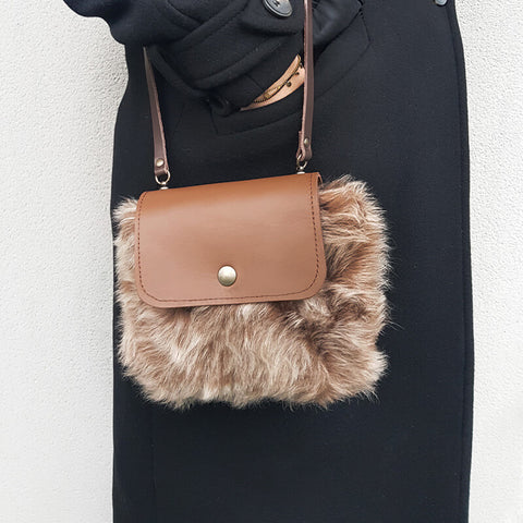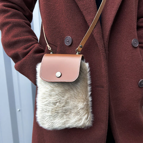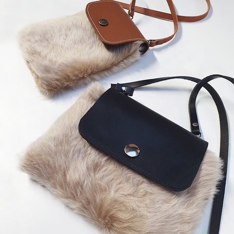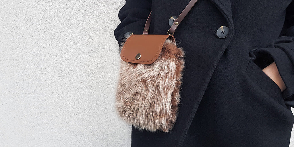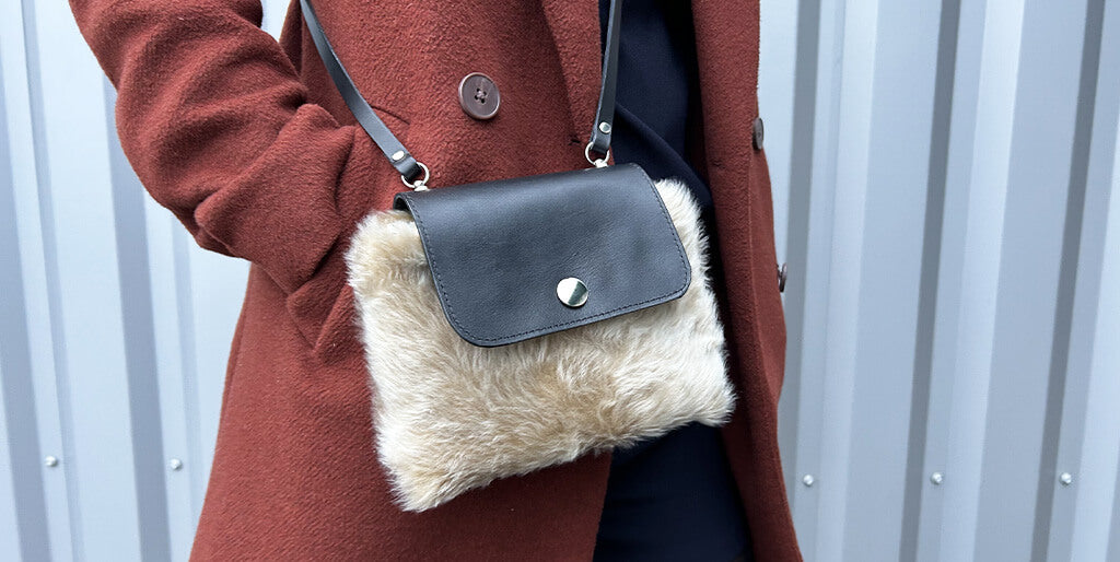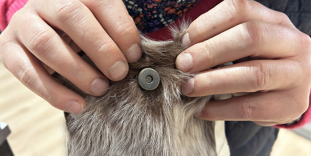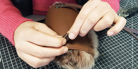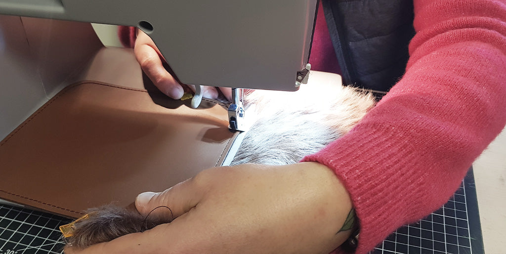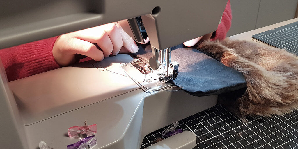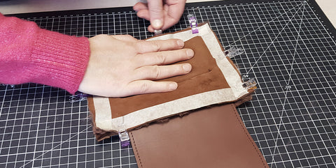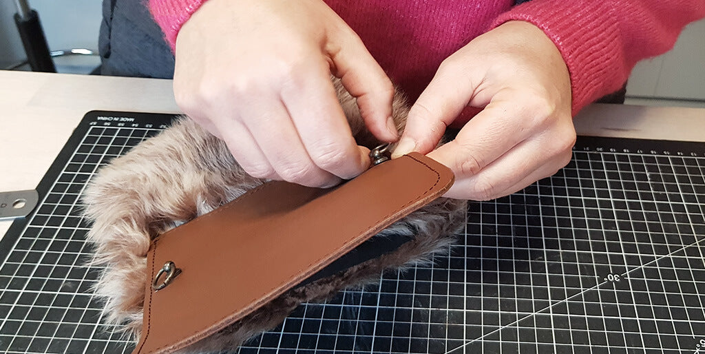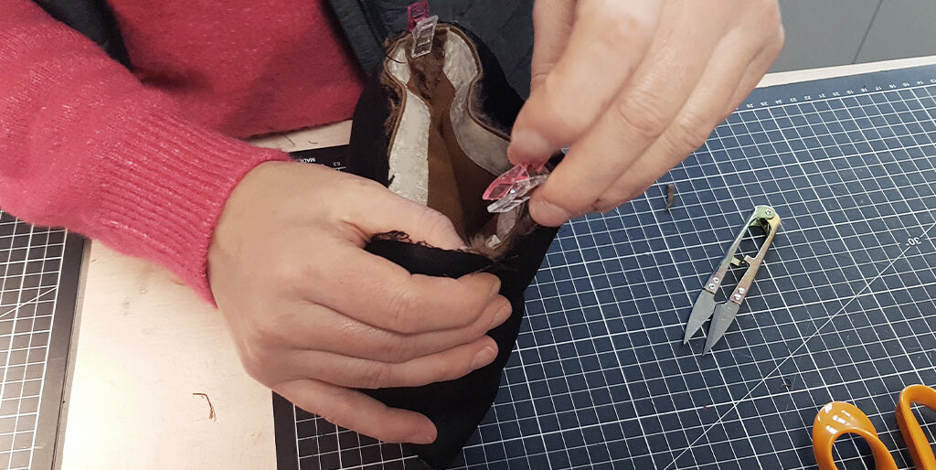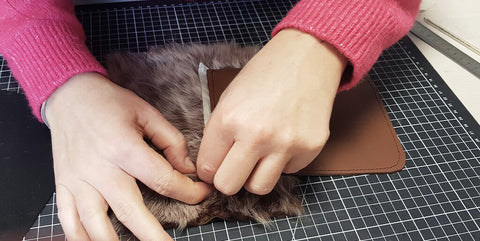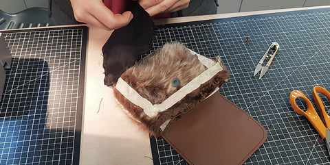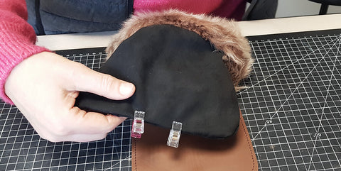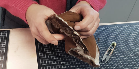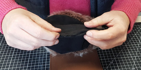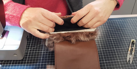 Enfiler la pochette lainée dans la doublure, endroit contre endroit. Positionner le rabat entre la doublure et la peau lainée (côté poils) pour qu’il ne soit pas cousu. Maintenir bord à bord avec des pinces de couture.
