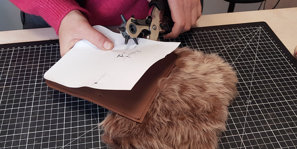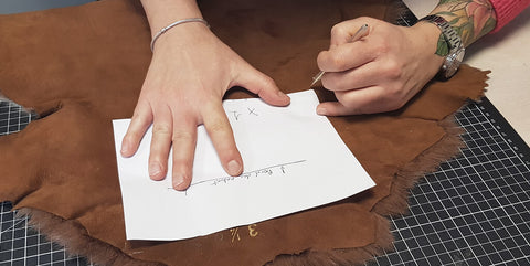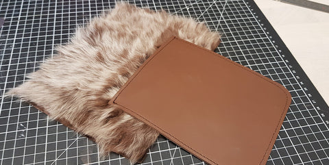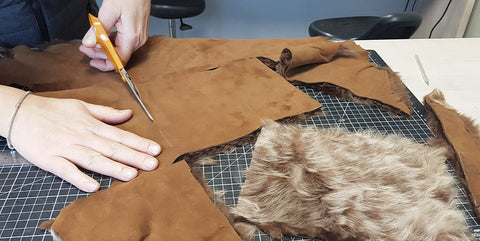 Découper deux fois la pièce P1 sur la peau de cuir de mouton lainé. Tracer le patron sur l’envers du cuir et couper avec une paire de ciseaux.