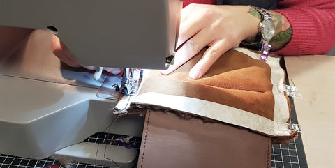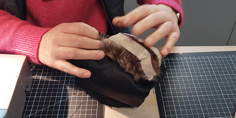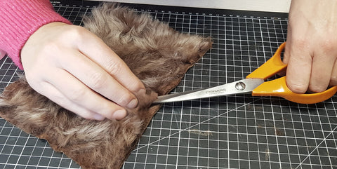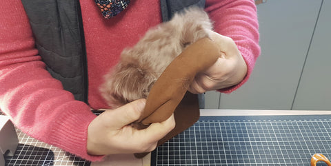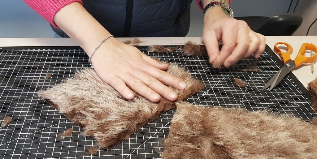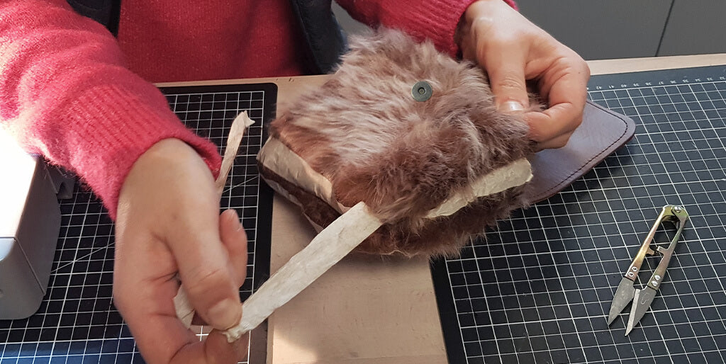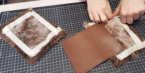 Pour faciliter les prochaines coutures, nous avons coupé et retiré les poils. Couper, avec une paire de ciseaux, les poils du cuir de mouton sur 1 cm tout autour des deux pièces P1. Avec du ruban de masquage, faire tenir les poils en arrière pour dégager la ligne de couture (pour que les poils ne gênent pas pendant la couture).