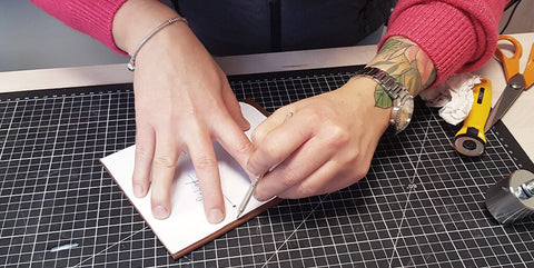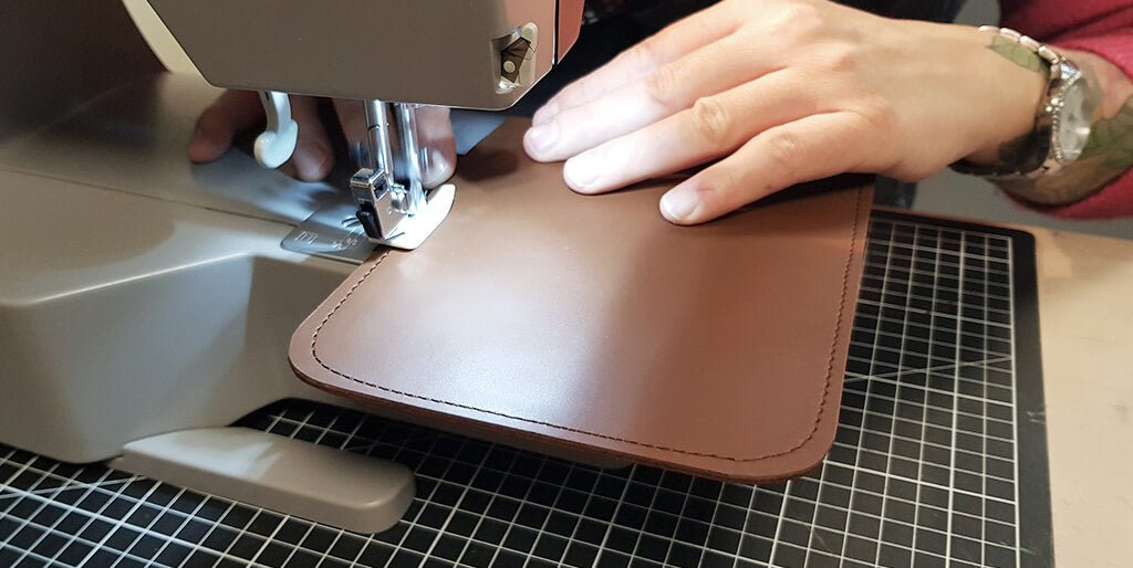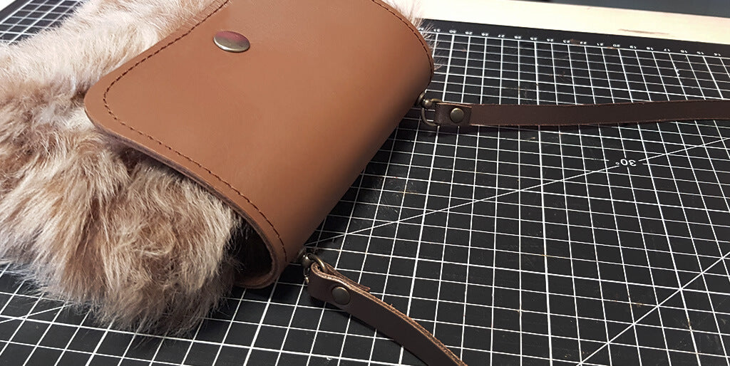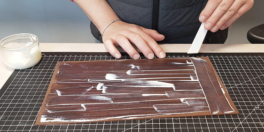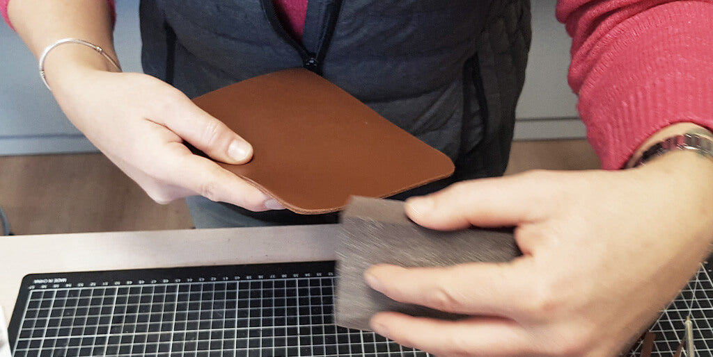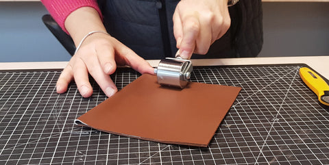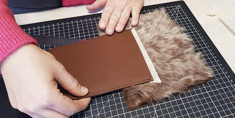 Appliquer de la colle contact pour cuir sur l’envers du morceau de 20 x 30 cm. Laisser la colle s’imprégner et plier en deux le morceau. Aplatir le collage avec un rouleau presseur en acier.