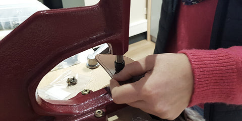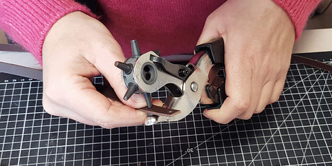 Prendre l’un des morceaux P1 et faire un trou à l’endroit prévu sur le patron. Puis, poser le fermoir top magnétique à riveter ou bouton pression.
