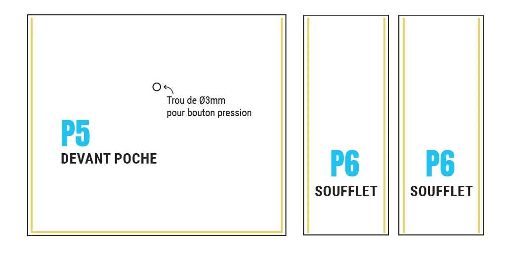 Coller les soufflets P6 sur les côtés de P5, à 3 mm du bord. Envers contre envers.