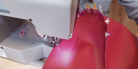 Coller avec le double-face, bord à bord, envers contre envers, les pièces P2 sur P1. Partir des milieux pour tomber juste. Maintenir le tout avec des pinces de couture.