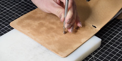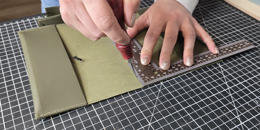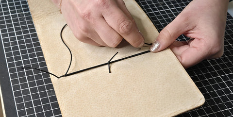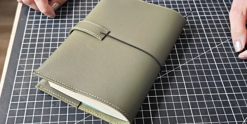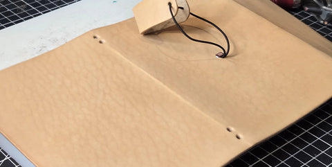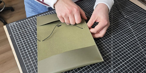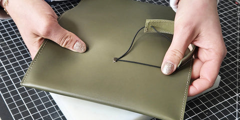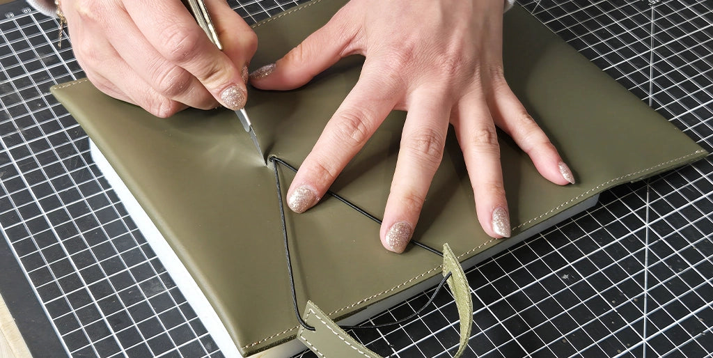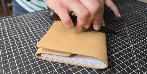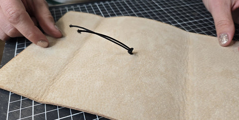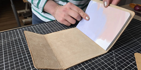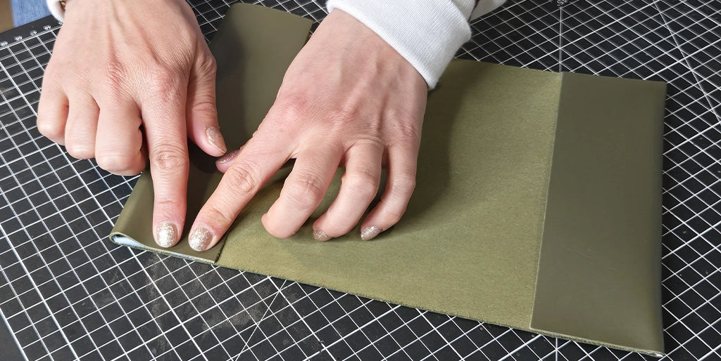 Prendre le carnet et le positionner dans le morceau de cuir : laisser environ 5 mm de marge tout autour du carnet. Marquer les plis aux endroits souhaités pour fermer le carnet. S'aider d'une lissette si besoin.