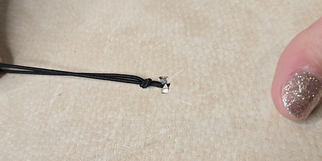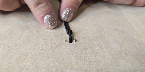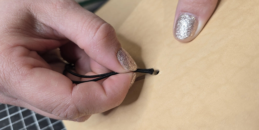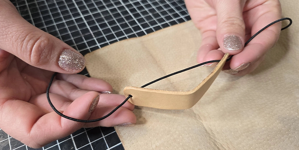 Prendre un élastique d'environ 40 cm et le passer dans les trous aux extrémités de la languette en cuir.