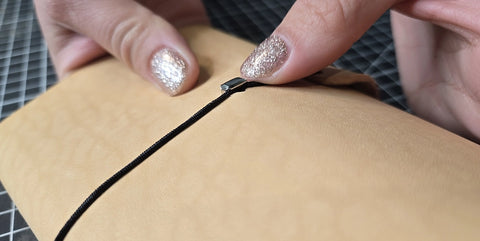 Plier le l'élastique en deux et le passer dans le trou en veillant à ce que les deux extrémités se retrouvent à l'intérieur du carnet.