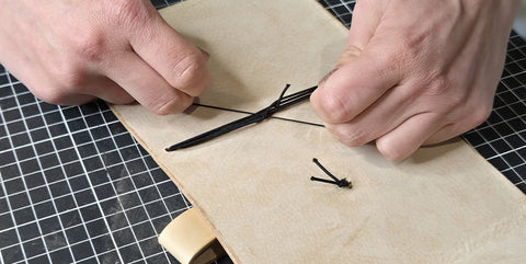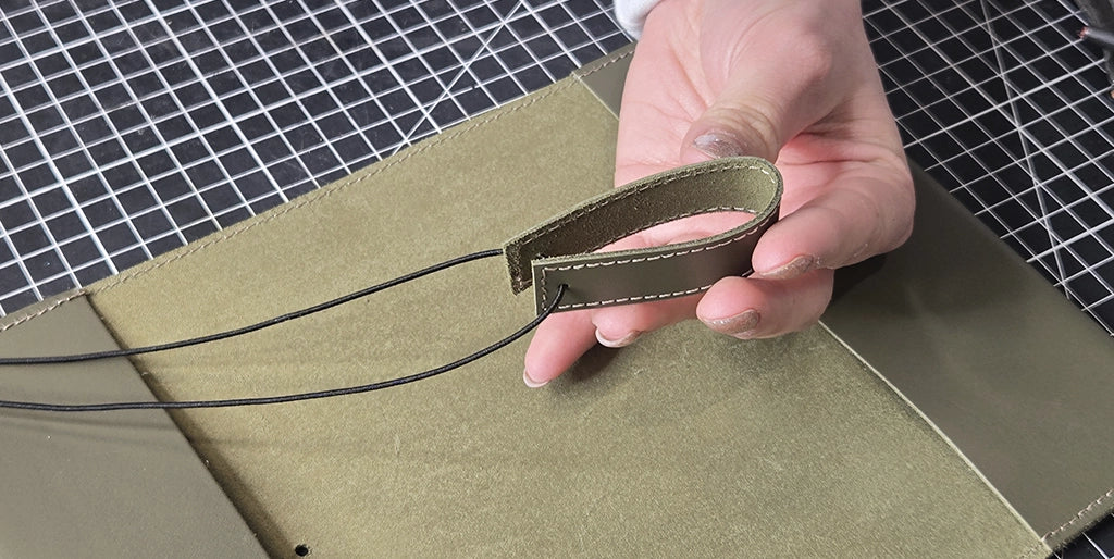 Insérer le carnet/livre dans le protège carnet. Faire un nœud non serré à l’extrémité de l'élastique et vérifier la taille en fermant le carnet. Ajuster la taille de l'élastique et faire un nœud bien serré.