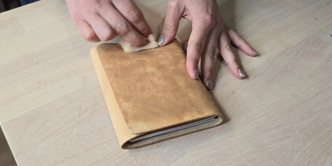 Si vous choisissez un cuir tannage végétal naturel, comme pour notre exemple de carnet au format A6, nous vous conseillons de nourrir le cuir avec de l'huile de pied de bœuf. L'huile va assouplir le cuir, lui apporter une légère protection et lui donner une teinte un peu plus foncée.