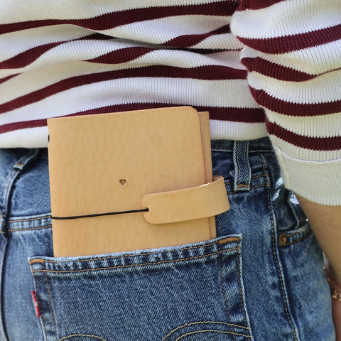 Personnaliser le carnet avec un marquage, soit sur la languette, soit sur un petit morceau de cuir au tannage végétal.