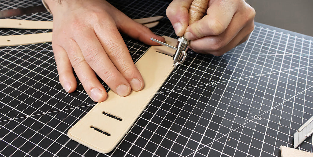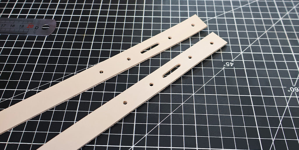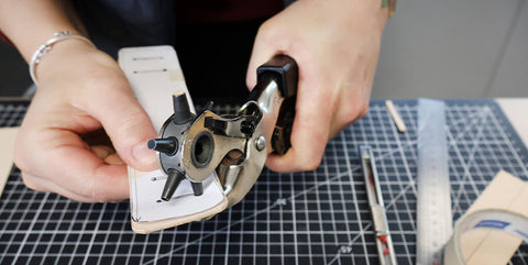 Percez les trous de 3 mm de diamètre avec un emporte-pièce rond à frapper. Pour le trou en oblong (enchapure), vous pouvez faire deux trous de Ø 3 mm et les relier avec un cutter.