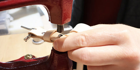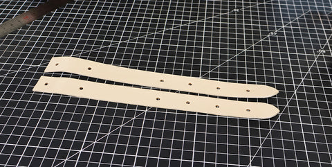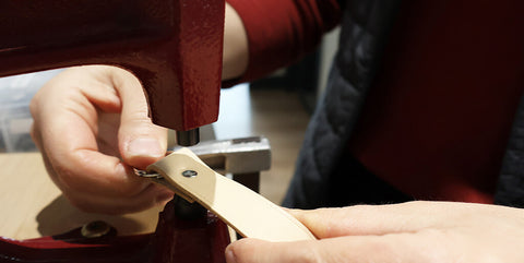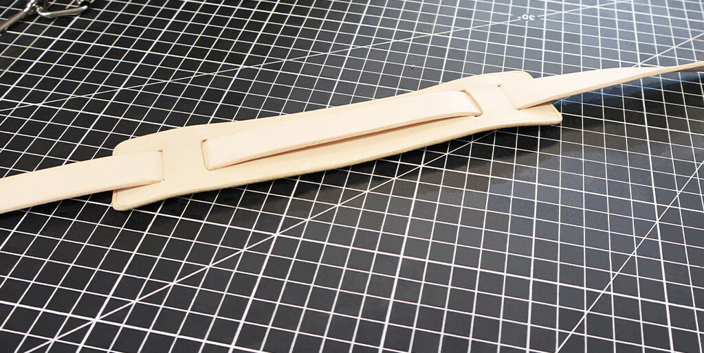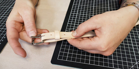 Enfilez le passant en cuir sur l'extrémité de la lanière, entre les deux derniers trous. Passez la boucle à ardillon dans le trou en oblong. Puis, fermez en fixant deux rivets. Répétez cette étape avec la deuxième extrémité de la lanière.