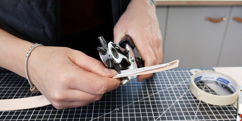 Téléchargez le patron et imprimez-le en taille réelle. Coupez la lanière de 2 cm de largeur à 106 cm de longueur et reportez la pièce P1 du patron sur les deux extrémités de cette lanière.