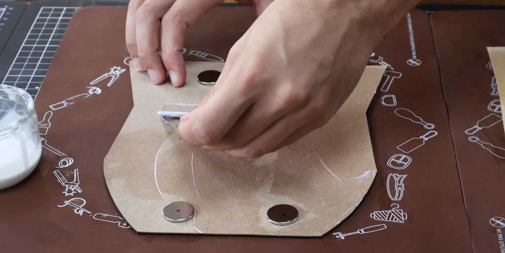 Coller les quatre aimants (colle néoprène ou glue) aux emplacements prévus sur le patron. Tester leur magnétisme pour s’assurer du bon positionnement final (un repère rouge est normalement visible sur l'une des faces de nos aimants, coller les aimants avec ce repère rouge visible pour les 4 aimants).