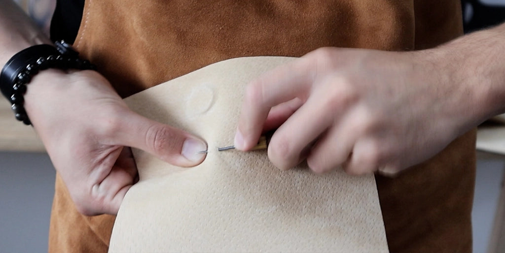 Percer un petit trou à chaque extrémité de la pièce P2. Sur la pièce P1, marquer les quatre trous du renfort intérieur P2 (voir patron). Pour chaque paire de trous, faire passer une aiguille ou une alêne ronde d’un trou à l’autre en traversant uniquement la doublure (ne pas percer le renfort Salpa et cuir). Cette méthode permet de créer un passage discret pour fixer la pièce P2.