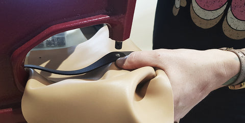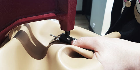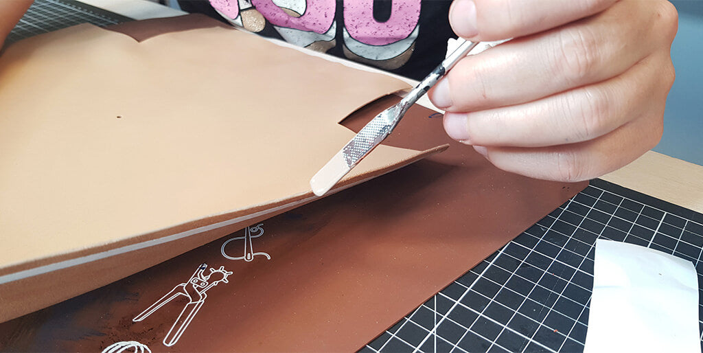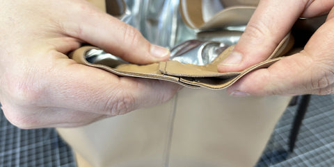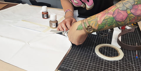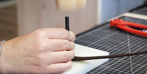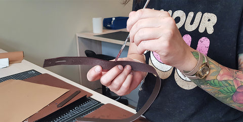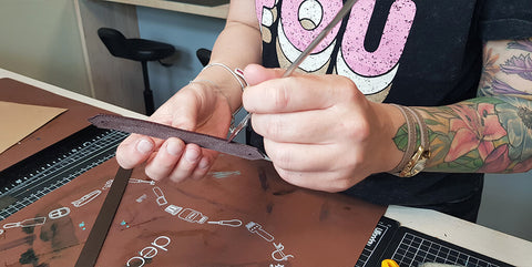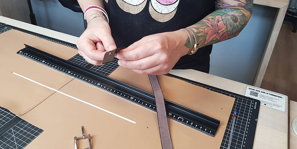 Pour renforcer le cuir, coller un bout d'indéchirable (ou un petit bout de cuir) au niveau des trous. Percer les différents trous avec un emporte-pièce rond de Ø 3 mm sur le cuir.