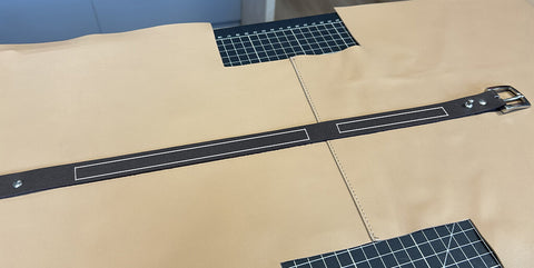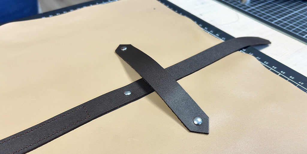 Fixer la lanière sur la pièce principale en posant les rivets aux deux emplacements prévus sur le patron.