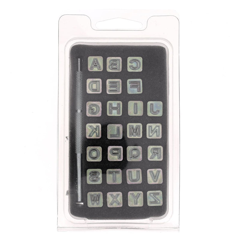 Dieses Stempelset enthält die 26 Buchstaben des Alphabets, einen Metallgriff zum Anbringen der Stempel, eine Anleitung in Englisch und eine Aufbewahrungsbox.