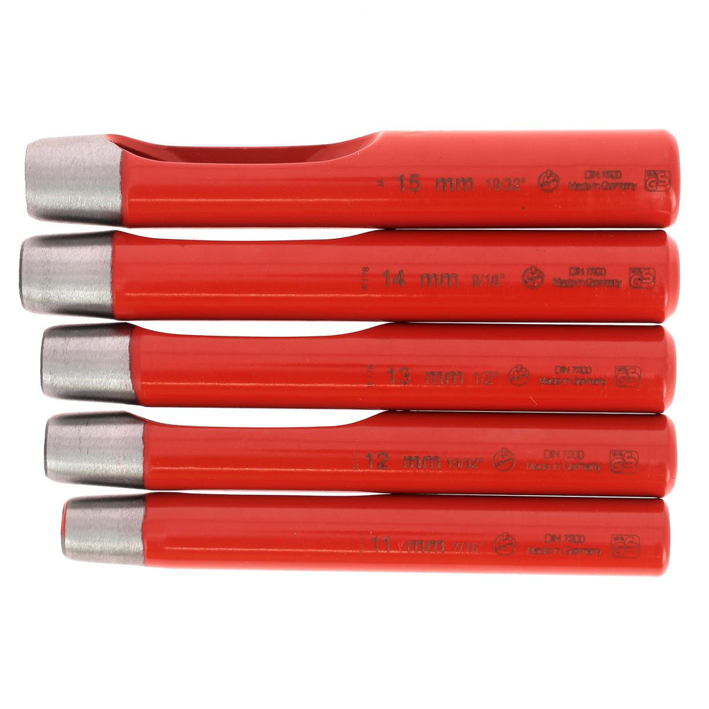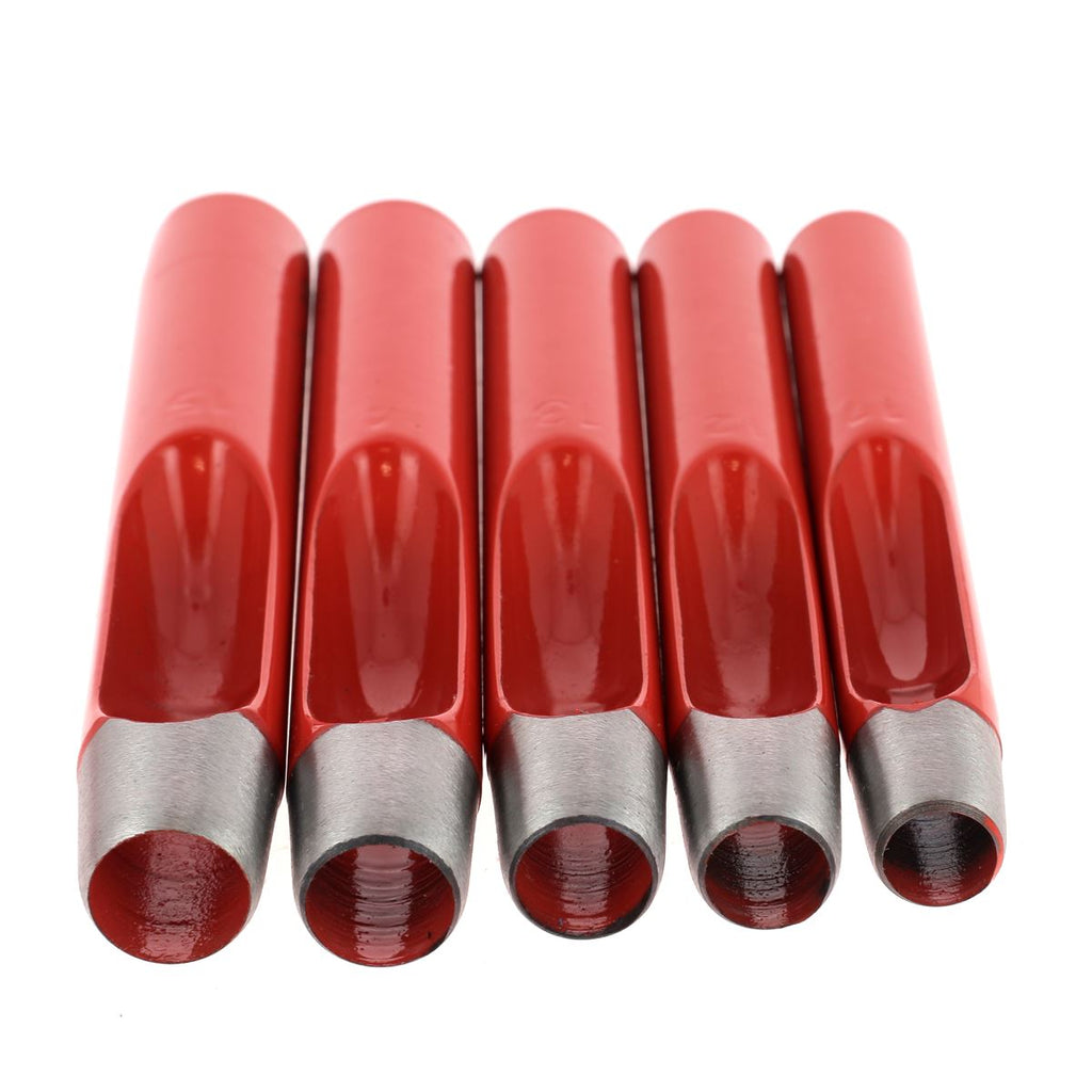 Set mit 5 runden Stanzmessern – ermöglicht das Stanzen von Löchern mit einem Durchmesser von 11 bis 15 mm. Gerader Ärmel Hochfeste Stahlklinge , die viele Male geschärft werden kann.