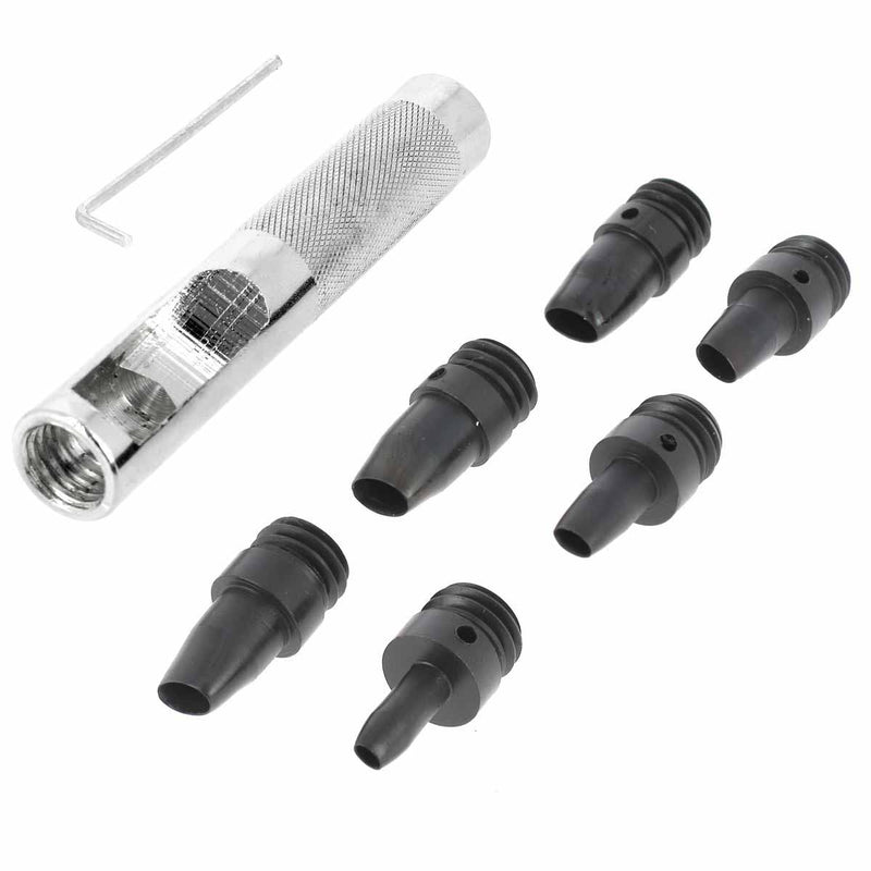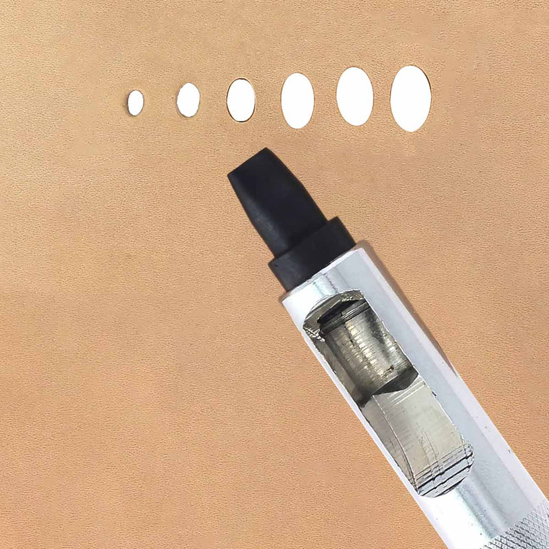 Diese 6 Mini-Stahlstanzer/-schneider schneiden schnell und präzise ovale Löcher in Leder. Sie sind austauschbar und lassen sich mit dem mitgelieferten kleinen Schraubenschlüssel einfach auf den Stahlgriff schrauben bzw. abschrauben.