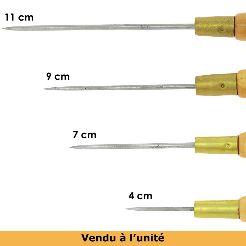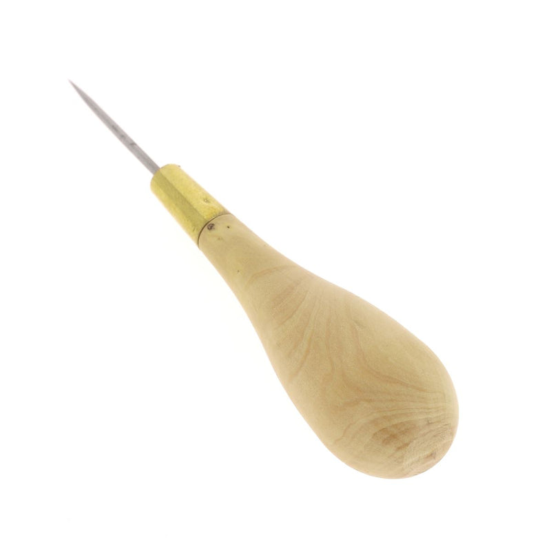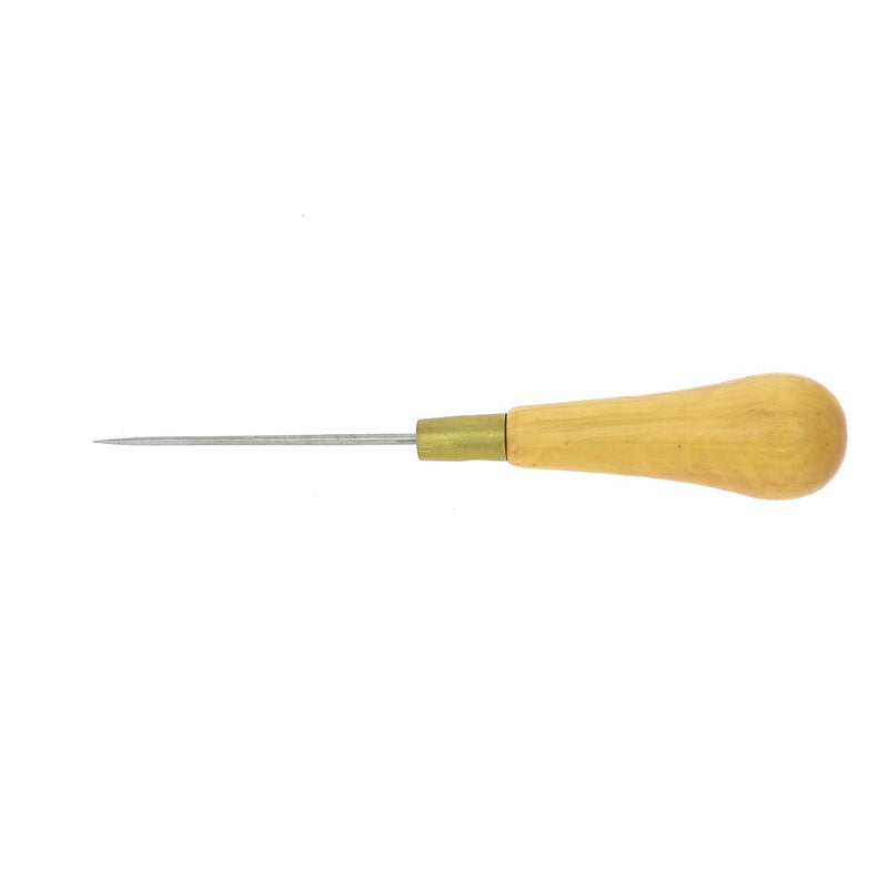 Mit der Rundahle lassen sich Löcher vergrößern oder umformen, um eine Naht zu stoppen. Im Gegensatz zur Zangenahle schneidet sie den Draht nicht durch. Verwenden Sie dieses Werkzeug für den Anfang und das Ende der Nähte Ihrer Lederkreationen.