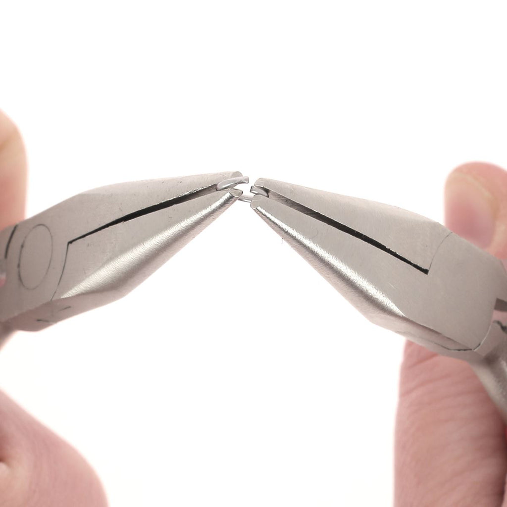 Um den Ring zu öffnen, ohne ihn zu verformen oder zu zerkratzen, empfiehlt es sich, mit zwei Flachzangen mit glatten Backen jedes Ende zu greifen und ihn dann zu den Seiten zu drehen (den Ring nicht auseinander spreizen). Fügen Sie die Elemente ein. Schließen Sie dann den Verbindungsring, indem Sie ihn in die andere Richtung drehen, sodass die beiden Enden perfekt einander zugewandt sind.