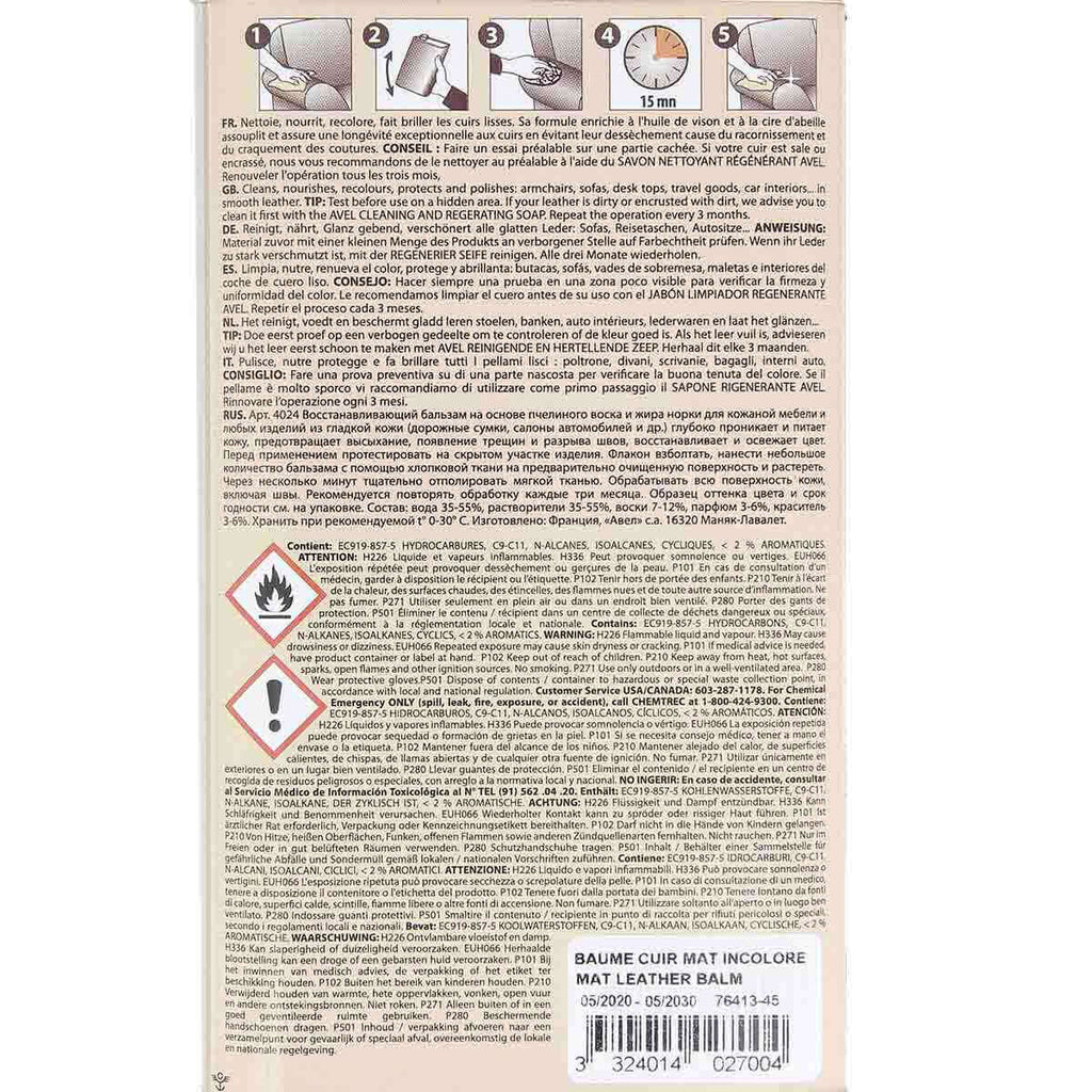Der AVEL Renovating Balm wurde speziell für mattes Leder entwickelt. Er pflegt und schützt alle glatten Polsterleder sowie Autoleder und Lederwaren. Seine mit Nerzöl und Bienenwachs angereicherte Formel macht das Leder weich und sorgt für eine außergewöhnliche Langlebigkeit, indem sie es vor dem Austrocknen durch Schrumpfen und Reißen der Nähte schützt.