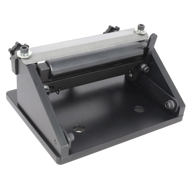 Um die Kanten eines Streifens zu brechen, legen Sie ihn zwischen die beiden Klingen, stellen Sie die rechte Klinge ein und ziehen Sie sie mit der Schraube fest. Ziehen Sie den Riemen mit der Hand. Sollte sich der Anfang schwer ziehen lassen, behelfen Sie sich mit dem beiliegenden Haken.