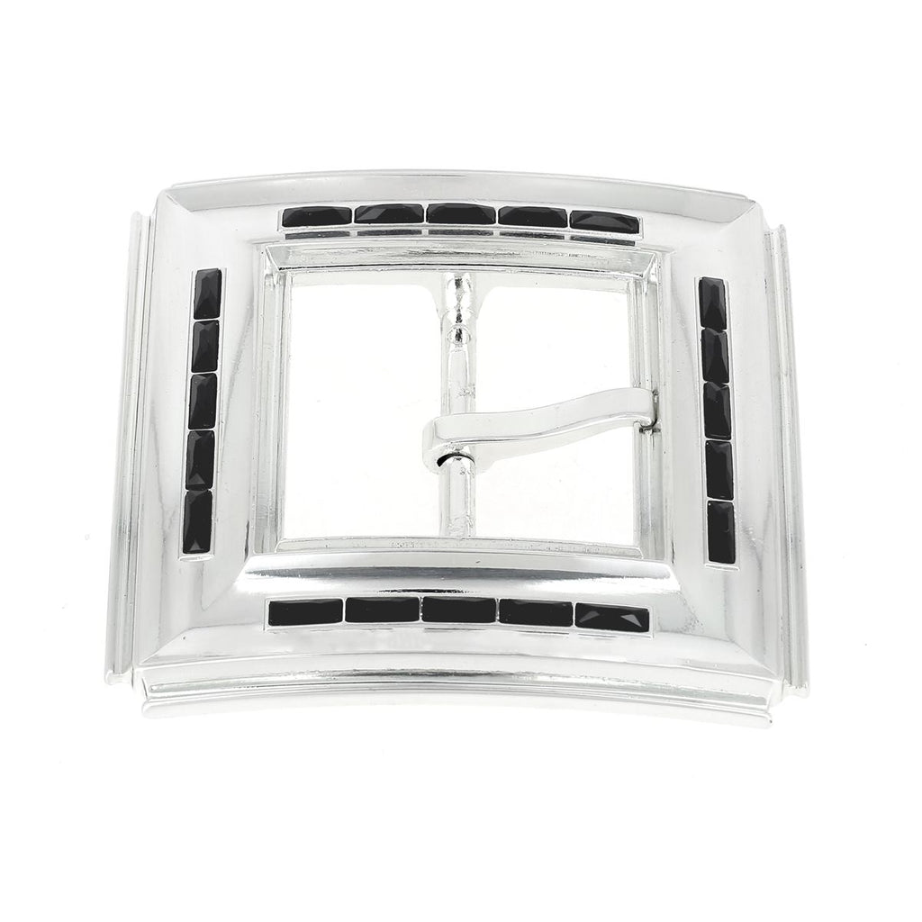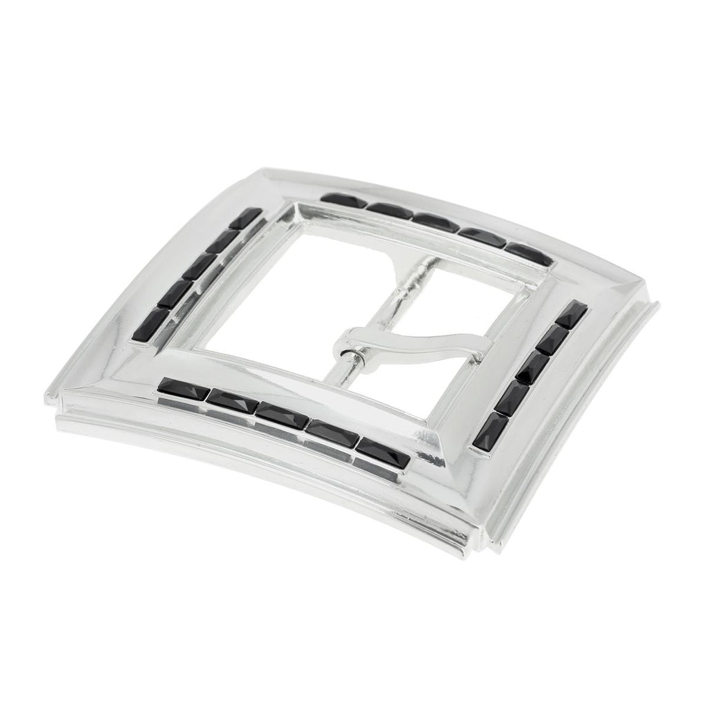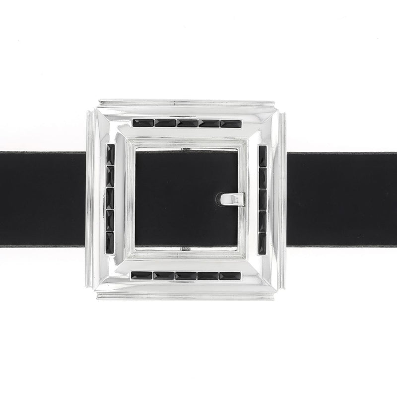 Diese Gürtelschnalle ist ideal für Modeliebhaber! Seine imposante quadratische Form fällt sofort ins Auge und die schwarzen Swarovski-Steine, die um die Konturen der Schnalle herum eingelegt sind, verleihen ihm einen Hauch von Glamour.