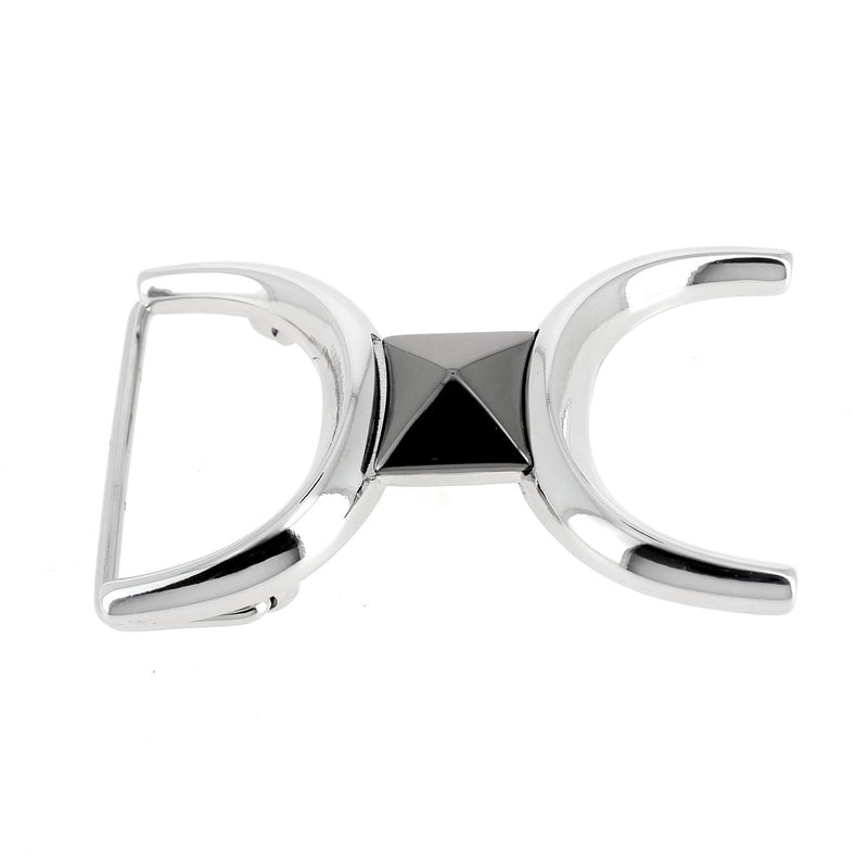 Diese sehr trendige Gürtelschnalle ist zweifarbig, mit zwei vernickelten Bögen und einer kleinen Rotgusspyramide in der Mitte.