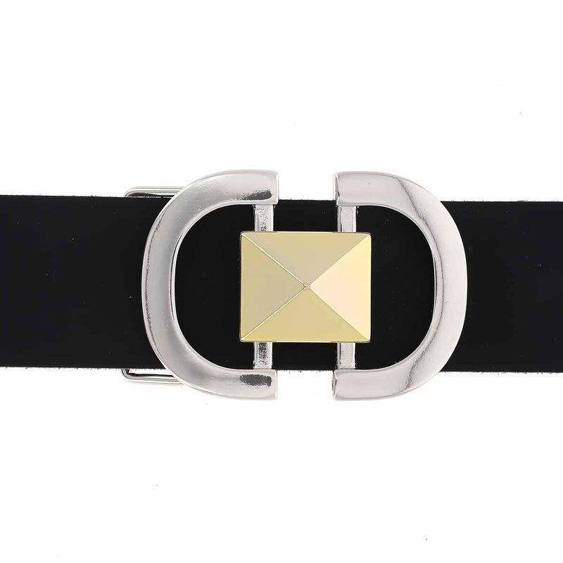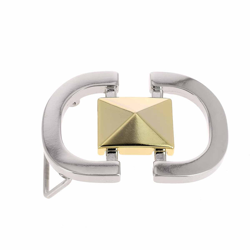 Diese sehr trendige Gürtelschnalle ist zweifarbig, mit zwei vernickelten Halbkreisen und einer kleinen hellgoldenen Pyramide in der Mitte, die einen hellen und schicken Touch verleiht.