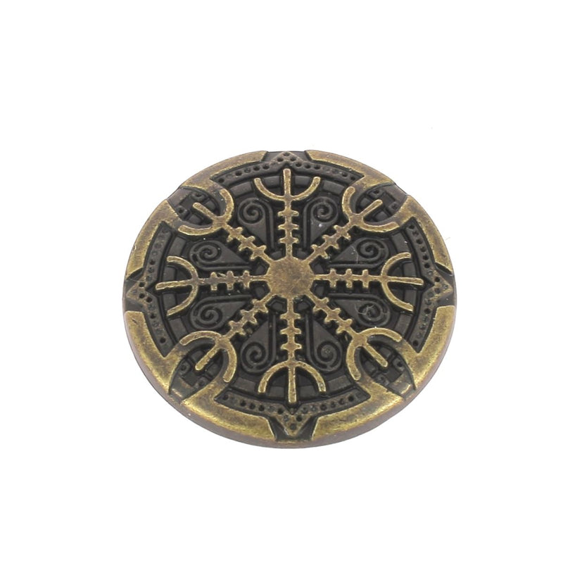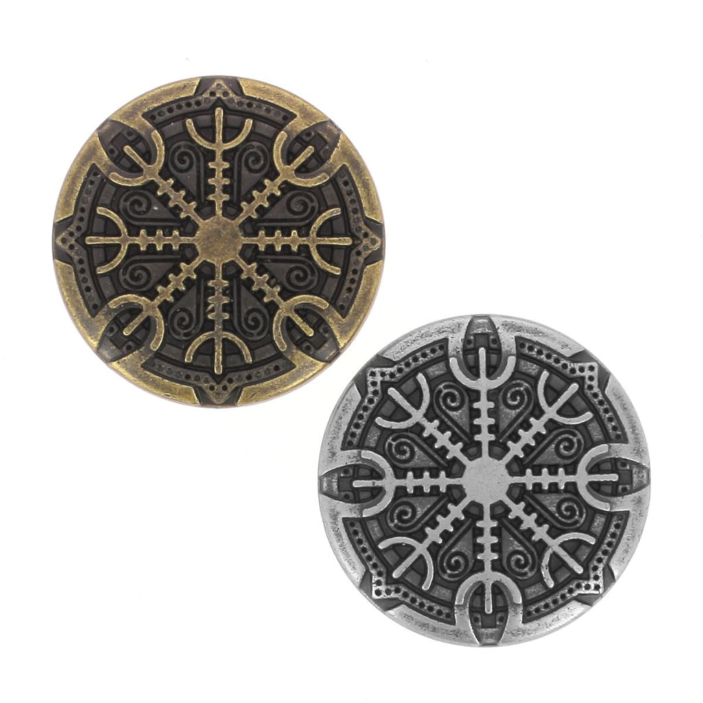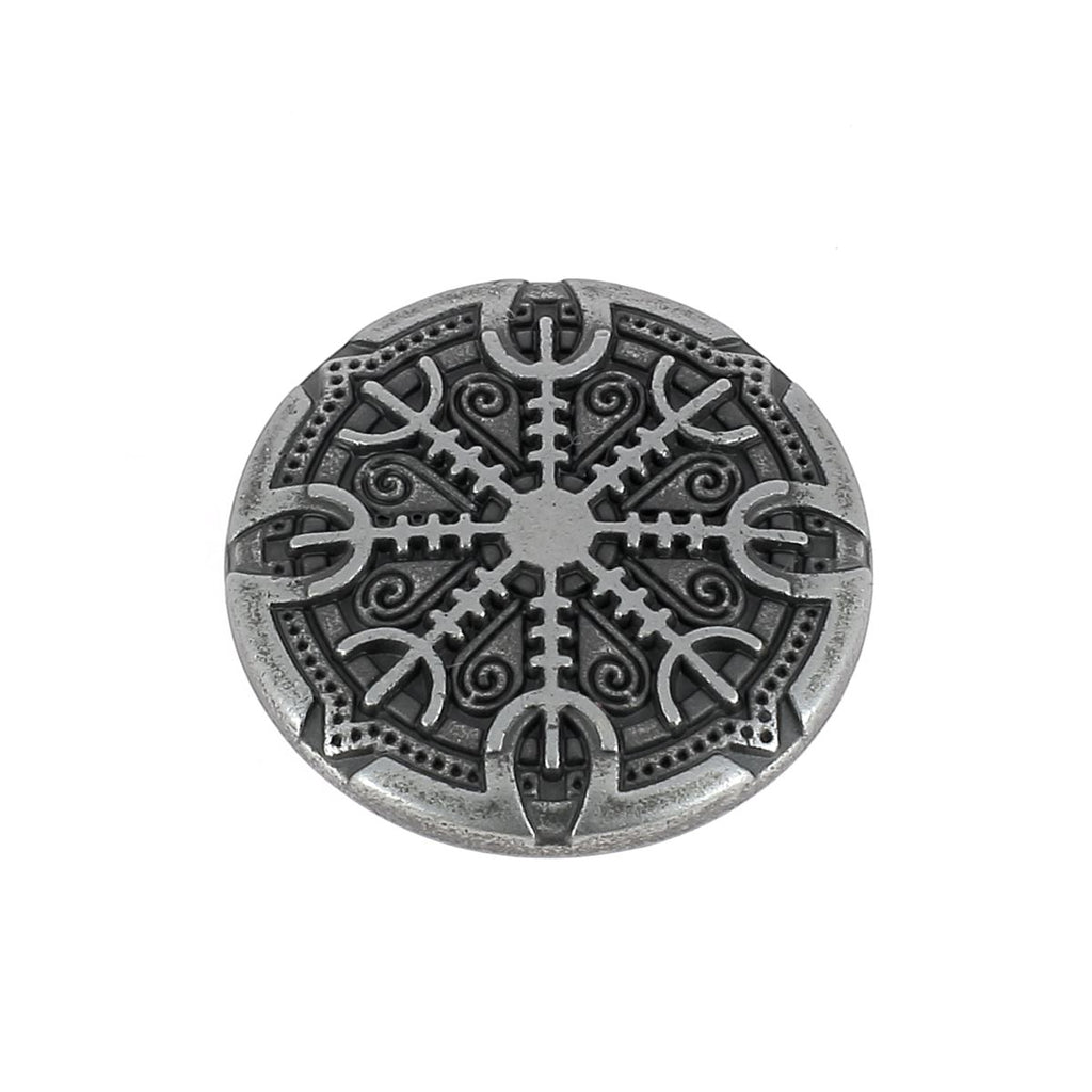 Tauchen Sie ein in die nordische Mythologie mit diesem runden Concho zum Aufschrauben, der mit dem berühmten Schutzsymbol der Wikinger verziert ist: dem „Helm der Ehrfurcht“ (auch Aegishjalmur, Helm der Angst oder Helm des Schreckens genannt).
