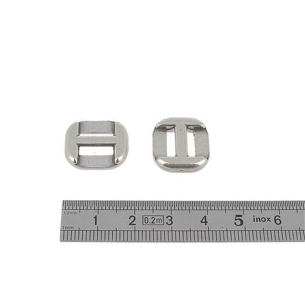 Schieber zwischen zwei Quadraten für ein Lederband mit 10 mm Breite und maximal 2,5 mm Dicke. Ideal für Ihre Armband-, Schmuck- und Deko-Kreationen.Material: Zamak garantiert nickelfrei