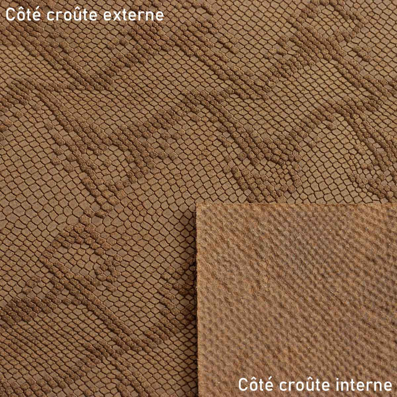 Die Reptilienimitation dieses Wildlederspaltleders wurde in 3D erstellt, was es sehr originell macht. Das Relief durch den 3D-Effekt verleiht seiner gelbbraunen Farbe leichte Farbnuancen.Tier: Kalb