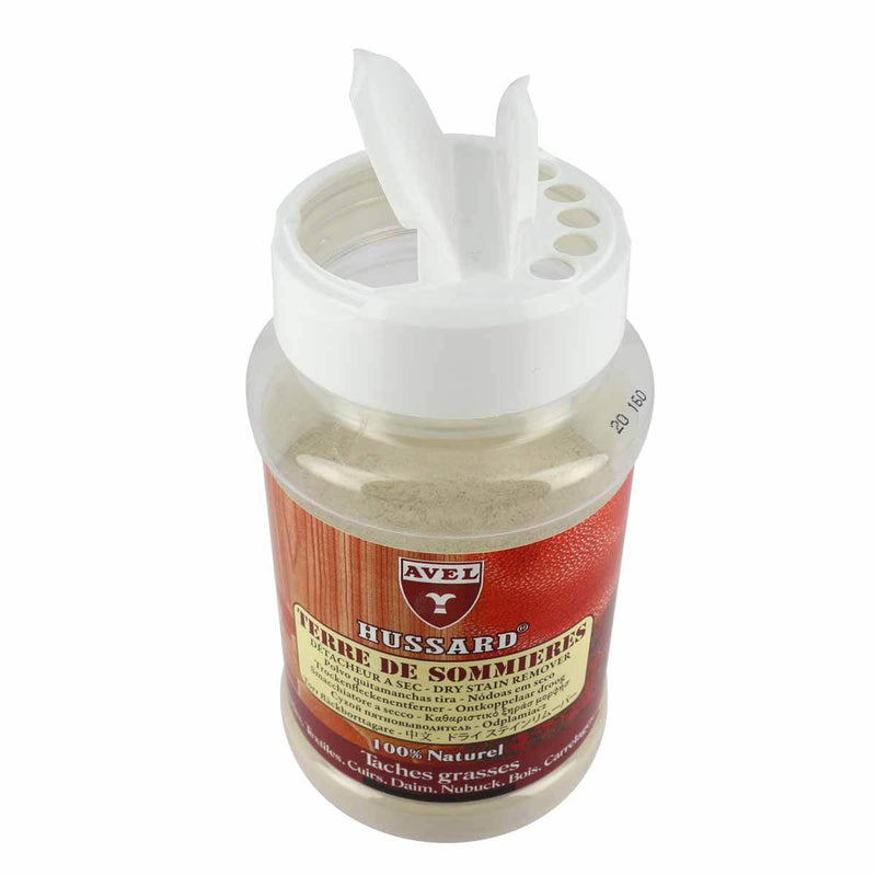 Natürlicher trockener Fleckenentferner, der durch Absorption fettige Flecken aus Leder, Wildleder, Nubuk, Textilien, Seide, Holz, Fliesen, porösem Stein und Papier entfernt .