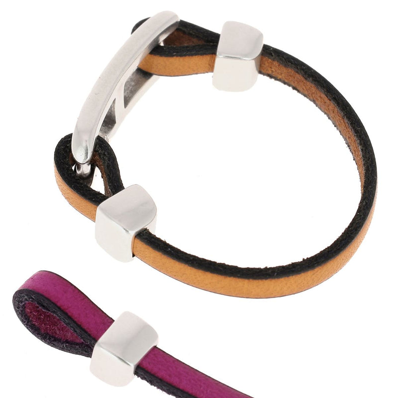 Mit diesem Verschlussende können Sie mit Ihrem Lederband eine Gleitschlaufe bilden und so ein selbstgemachtes Modeschmuckstück herstellen. Es ist für einen flachen Lederriemen mit 5 mm Breite und maximal 2,5 mm Dicke geeignet.