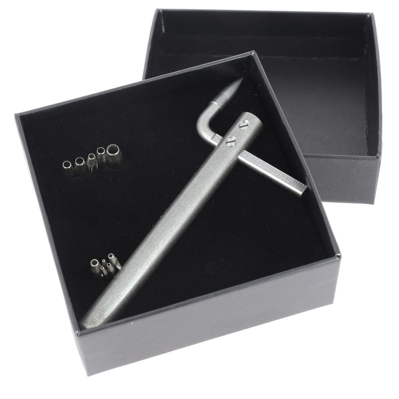 Dieses Werkzeug wird mit 10 runden Stempeln mit einem Durchmesser von ca. 0,6 mm bis 4 mm geliefert. Sie können den Spielraum Ihrer Kreationen erweitern, indem Sie aus unserem großen Sortiment an Präzisionsschneidern (rund, quadratisch, diamantförmig usw.) in mehreren Größen eine weitere Spitze auswählen. Der Wechsel erfolgt einfach durch das Lösen der unteren Schraube.