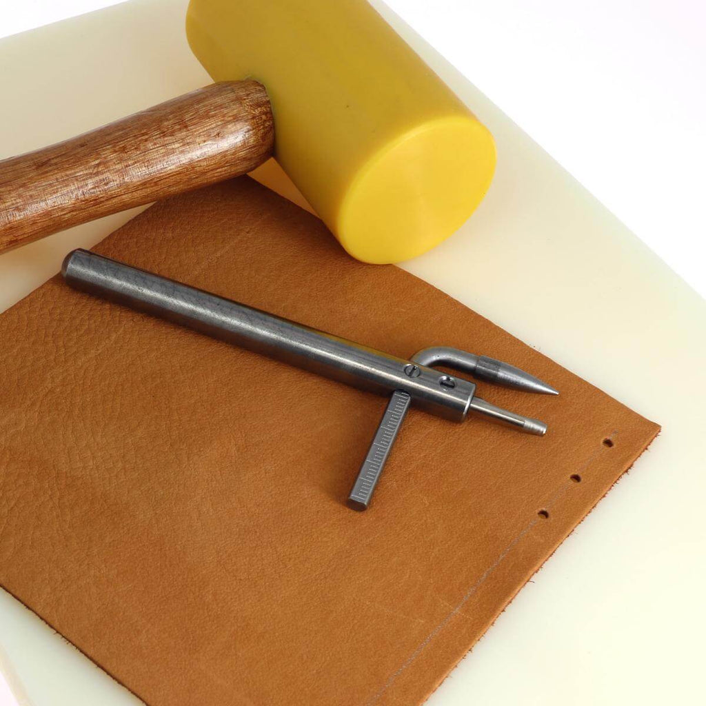 Schlagen Sie mit Ihrem Locher auf das Stück Leder und verschieben Sie es dann, um die gewünschte Anzahl Löcher zu machen.