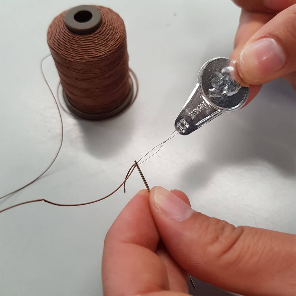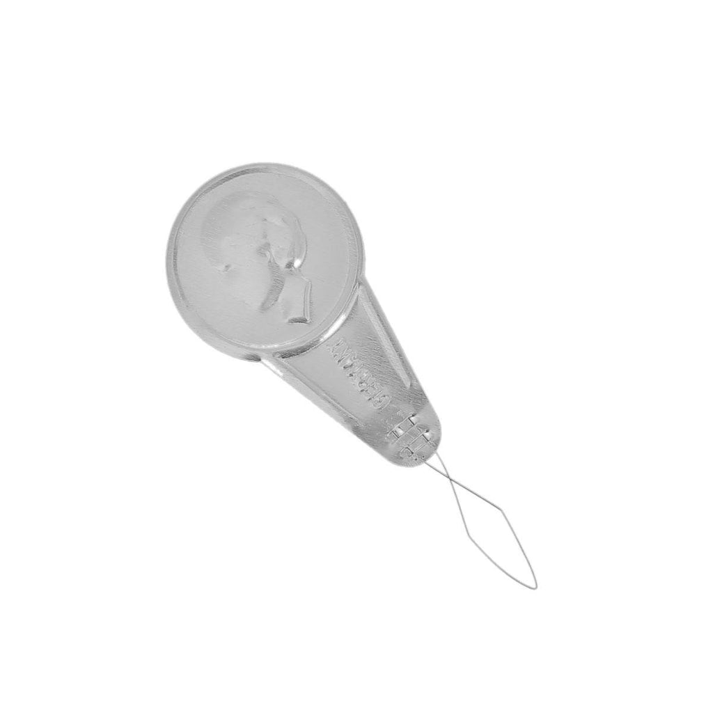 Erleichtern Sie sich das Leben mit dem Nadeleinfädler! Führen Sie die Stahldrahtschlaufe durch das Nadelöhr, legen Sie Ihren Faden in die Schlaufe ein und schieben Sie das Werkzeug dann zurück, um den Faden durch das Nadelöhr zu führen.