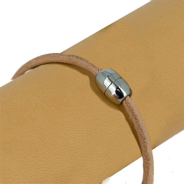 Schmuckverschluss in Form einer Magnetkapsel für ein rundes Lederband .Die beiden Teile passen zusammen und werden durch einen Magneten zusammengehalten.