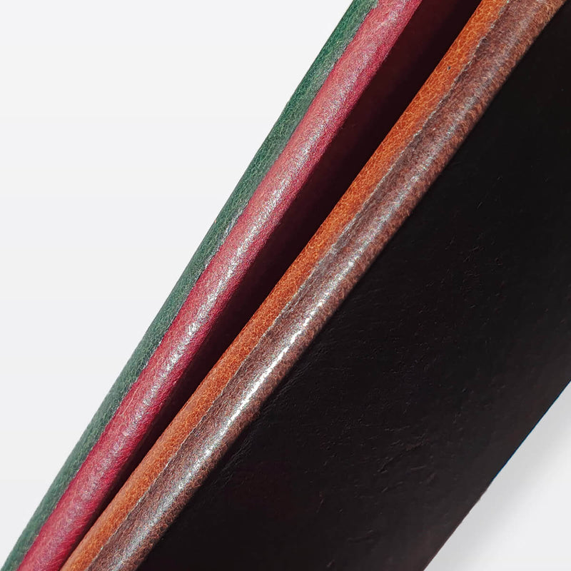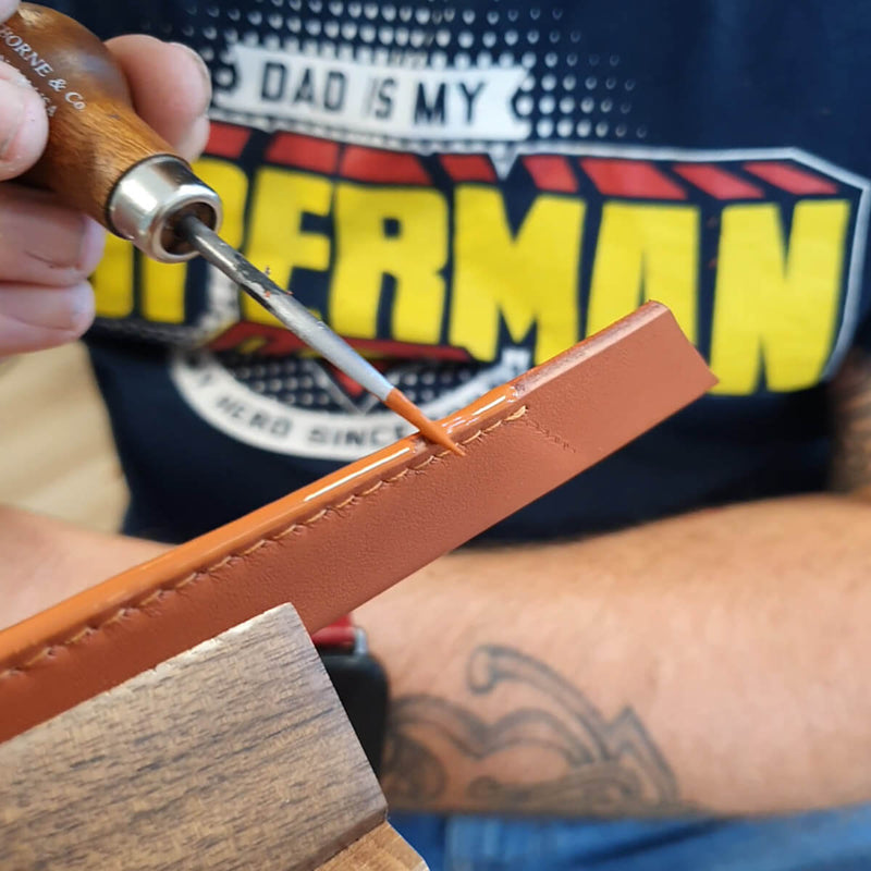 - Auftragen eines Finishs (Farbe) auf die Kante von pflanzlich und mineralisch gegerbtem Leder.