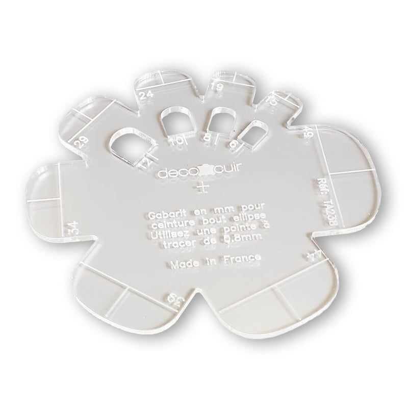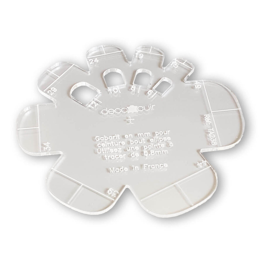 Um Ihre elliptischen Gürtelenden (rund, abgerundet) schnell und einfach herzustellen, bietet Ihnen Deco Cuir seine Plexiglasschablone an!Im Gegensatz zu anderen „amerikanischen“ Vorlagen ist die Deco Cuir-Vorlage in mm angegeben und passt perfekt zu europäischen Bandbreitenstandards.