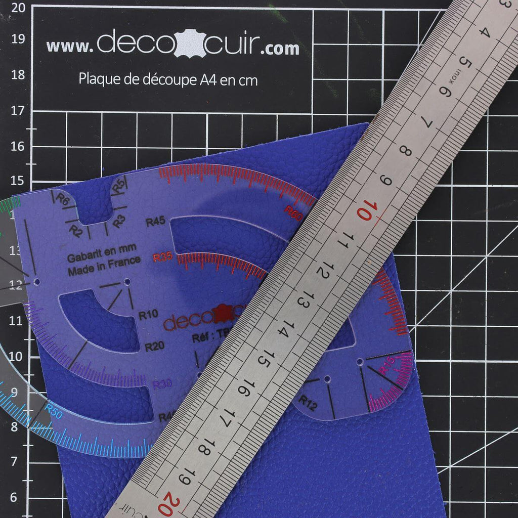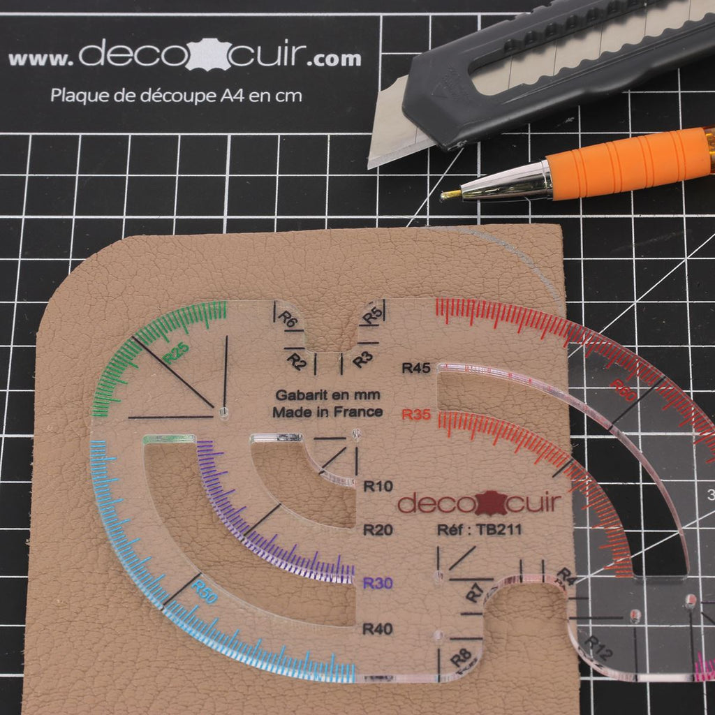 Mit dieser von Deco Cuir angebotenen Vorlage können Sie ganz einfach 18 perfekt abgerundete Ecken an Ihren Ledern und Mustern anbringen!