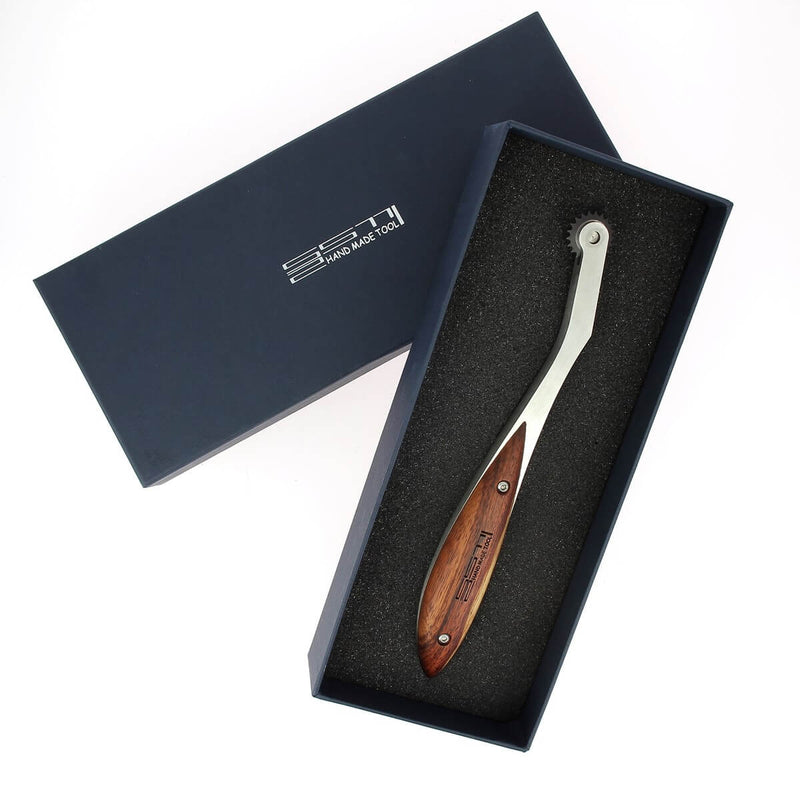 Der Griff aus Palisanderholz wurde für einen optimalen und angenehmen Halt konzipiert und durchdacht. Sie werden die Form des Griffs zu schätzen wissen, der sehr gut in der Hand liegt. Da die Farbe und Maserung jedes Holzstücks unterschiedlich ist, ist jedes Werkzeug ein Unikat.