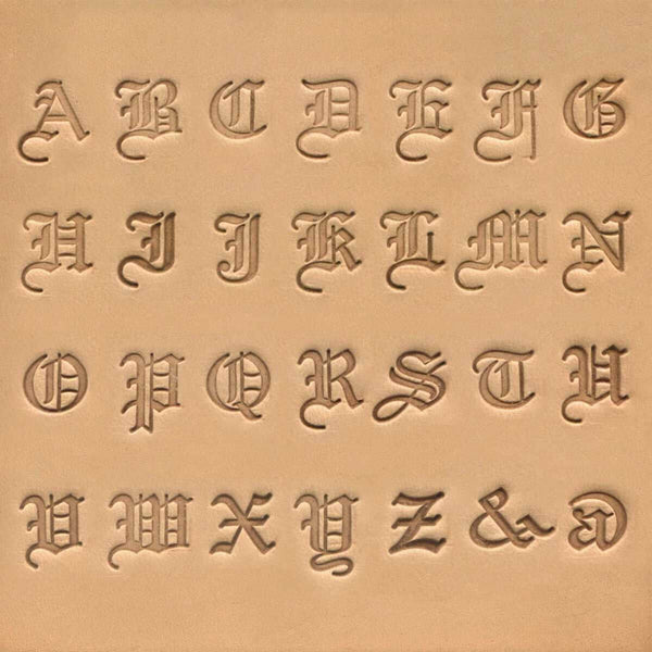 Dieses Stempelset enthält die 26 Buchstaben von A bis Z , 10 Zahlen von 0 bis 9 und die altenglischen Zeichen „&“ und „@“, sowie einen Metallbügel zum Befestigen der Stempel und eine Aufbewahrungsbox.