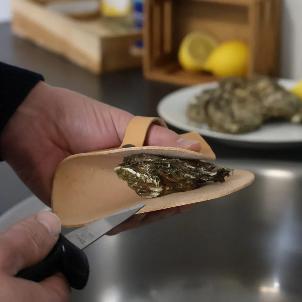 Set zum Selbermachen eines Austernhandschuhs aus Leder . Kreieren Sie Ihren eigenen Austernhandschuh aus Leder. Ein sehr einfaches und praktisches Projekt für Austernliebhaber.Dank des Lederhandschutzes lassen sich Austern jetzt sicher öffnen.